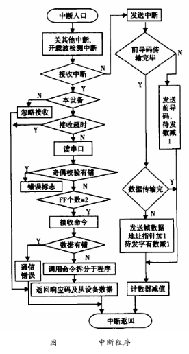 在HART通信中,鉆井泥漿流量計作為從設備進行通訊,所以這里的軟件設計只是針對于從設備。HART通信采用水平和垂直校驗的方法。當檢測到接收數(shù)據(jù)有差錯時,則等到主設備命令幀發(fā)完后,通知主設備數(shù)據(jù)接收有誤。主設備則重新發(fā)命令幀,從而保證通信的準確可靠。HART中斷子程序流程圖如圖6所示。由于HART通信為主從方式,HART幀中每個字節(jié)在物理層傳輸需要9ms左右,為了保證通訊的實時性,通訊程序采用串行口終端接收/發(fā)送。該中斷所要完成通信中的主要任務,即接收和發(fā)送幀,幀的拆分和打包。