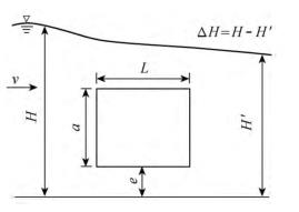 有限水域的浮體結(jié)構(gòu)在不同來流動(dòng)水中運(yùn)行時(shí),浮體結(jié)構(gòu)位置的改變會對流場產(chǎn)生影響,從而影響浮體結(jié)構(gòu)的泄流能力以及穩(wěn)定性。試驗(yàn)過程中固定浮體結(jié)構(gòu)的體型不變(長L=0.20m,寬B=0.30m,高a=0.10m),分別選取4種不同來流流量Q及浮體結(jié)構(gòu)位置e,控制浮體結(jié)構(gòu)在上、下游水位不變的條件下進(jìn)行試驗(yàn),具體試驗(yàn)參數(shù)設(shè)計(jì)及說明見表1以及圖2。