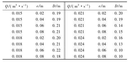 表3中,當(dāng)來流流量較小時(shí)(Q=0.015m3/s),回流區(qū)的長(zhǎng)度D隨著浮體結(jié)構(gòu)位置的增大逐漸增大;當(dāng)來流流量較大時(shí)(Q=0.024m3/s),回流區(qū)的長(zhǎng)度卻隨著浮體結(jié)構(gòu)位置的增大呈現(xiàn)減小的趨勢(shì)。試驗(yàn)過程中,當(dāng)浮體結(jié)構(gòu)位置較高且來流較小時(shí),浮體結(jié)構(gòu)上下部區(qū)域的主流流速較小,回流區(qū)范圍較大;浮體結(jié)構(gòu)位置不變時(shí),來流流量增大,回流區(qū)長(zhǎng)度減小。來流增加,下泄水流流速較大,并迅速將回流區(qū)內(nèi)的水流帶入下游區(qū)域,因此回流區(qū)長(zhǎng)度反而呈現(xiàn)減小趨勢(shì)。