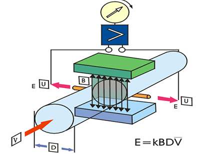 此時(shí),如果具有一定電導(dǎo)率的流體流經(jīng)測(cè)量管。將切割磁力線感應(yīng)出電動(dòng)勢(shì)E。電動(dòng)勢(shì)E正比于磁通量密度B,測(cè)量管內(nèi)徑d與平均流速v的乘積。電動(dòng)勢(shì)E(流量信號(hào))由電極檢出并通過電纜送至轉(zhuǎn)換器。轉(zhuǎn)換器將流量信號(hào)放大處理后,可顯示流體流量,并能輸出脈沖,模擬電流等信號(hào),用于流量的控制和調(diào)節(jié)。