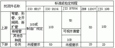 為獲得正常測量精確度,電磁流量傳感器上游也要有一定長度直管段,但其長度與大部分其它流量儀表相比要求較低。90°彎管、T形管、同心異徑管、全開閘閥后通常認(rèn)為只要離電極中心線(不是傳感器進(jìn)口端連接面)5倍直徑(5D)長度的直管段,不同開度的閥則需10D;下游直管段為(2~3)D或無要求;但要防止蝶閥閥片伸入到傳感器測量管內(nèi)。各標(biāo)準(zhǔn)或檢定規(guī)程所提出上下游直管段長度亦不一致,匯集如表1所示,要求比通常要求高,這是由于為保證達(dá)到當(dāng)前0.5級(jí)精度儀表的要求。表1