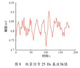在頻域中對紙漿信號觀察時(shí)發(fā)現(xiàn),紙漿信號的漿液噪聲頻帶在零頻率點(diǎn)附近,距離流量信號基波頻率點(diǎn)較遠(yuǎn),對基波幅值和各奇次諧波幅值基本沒有影響,紙漿信號在頻域中的圖形如圖7所示。選擇一組采集的紙漿信號,把其等分成數(shù)段,利用MATLAB計(jì)算每段數(shù)據(jù)在基波處的幅值并提取保存在一個(gè)數(shù)組中,使用繪圖工具畫出來,如圖8所示??梢?,基波幅值在4.7~4.95mV變化,波動(dòng)較小。因此,提取到的與流量相關(guān)的感應(yīng)電動(dòng)勢信號幅值會(huì)比較穩(wěn)定。