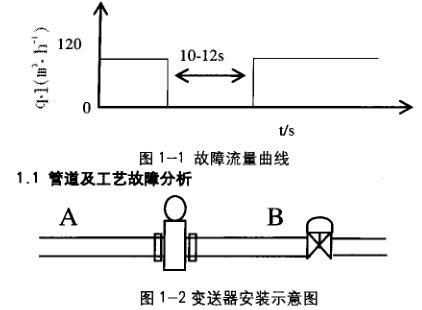 被測(cè)液從A流向B(如圖1-2),傳感器水平安裝,電極水平,傳感器下游2m處裝有調(diào)節(jié)閥,從圖中可以排除由于傳感器中急劇潴留氣和傳感器后無背壓等情況導(dǎo)致的測(cè)量脈動(dòng)情況產(chǎn)生。
