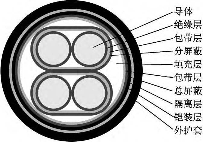 該新型電纜的結構如圖1所示。導體為單股退火鍍錫軟銅線,以提高導體的導電性和防腐蝕性。在導體外繞包一層?。疲矗ň鬯姆蚁┌雽щ妿В欣诮档蛯w和絕緣之間的摩擦起電噪音。絕緣采用材料較為純凈、介電常數較小、具有一定彈性的聚丙烯絕緣級材料,并采用擠壓式擠出,減小絕緣層與導體的間隙。采用對絞組作為信號傳輸線,由于在兩根傳輸線上感應的電壓接近相等,減小了電壓差值,提高了信號傳輸穩(wěn)定性;對絞組由兩種不同顏色絕緣線芯組成,相鄰線對對絞節(jié)距應不大于100mm。對絞分屏蔽組(即對對絞組進行分屏蔽,每對對絞組外繞包兩層聚酯帶和一層厚0.04mm鋁塑復合帶繞包,內置一根7×0.26mm鍍錫銅絞線作引流線)有利于對不同對絞組之間信號串音的抑制和隔離。對絞分屏蔽組同心式絞合成纜,在對絞分屏蔽組間填充非吸濕性材料,以保證纜芯圓整。在成纜纜芯外繞包兩層聚酯帶,再采用鋁塑復合帶繞包,內置鍍錫銅線作引流線,以提高電纜電磁屏蔽能力??偲帘螌油鈹D包隔離層(隔離護套),隔離層采用絕緣級低密度聚乙烯材料。隔離層外采用鎧裝層,鎧裝材料為高導磁合金鋼帶,其為強磁材料,可將外來的磁通大部分限制在鎧裝層的外表面上(僅有少部分能進入被屏蔽的空間);鎧裝時對高導磁合金鋼帶采用縱包焊接,確保其形成一連續(xù)圓柱管;鎧裝層可提高電纜抗電磁干擾水平以及對電纜進行加強,減少電纜振動引起的電動勢。外護套采用藍色軟PVC(聚氯乙烯)護層級電纜材料擠包,實現電纜防護。