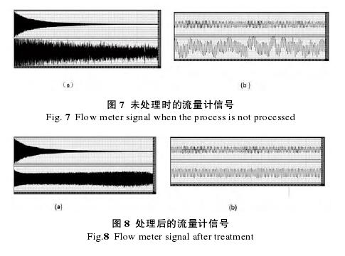 圖 7 為未處理時(shí)流量計(jì)輸出的傳感器信號(hào)和放大器輸出信號(hào)。圖 7(a)上部為傳感器輸出的原始信號(hào),下部為放大器輸出信號(hào);
