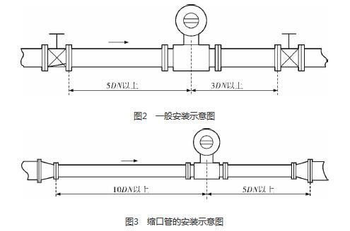 硝酸管道流量計(jì)的安裝質(zhì)量對其測量結(jié)果的影響較大,因此在安裝時(shí)需要注意幾個(gè)問題。*先,硝酸管道流量計(jì)直管段的選擇在配管時(shí)一定要按照要求進(jìn)行選擇,一般選擇流量計(jì)通徑與工藝管道通徑相同,即可滿足工程需要,而且安裝方便、壓力損失小,流量計(jì)直管段上游側(cè)的長度不少于5倍工藝管道直徑,下游側(cè)的長度不少于3倍工藝管道直徑(圖2)。但在流速太慢而又要求精度較高或需要變徑的應(yīng)用場合,可選擇通徑小于工藝管道通徑的流量計(jì),以提高測量精度,此時(shí)流量計(jì)上、下游必須加裝異徑管,且進(jìn)口異徑管上游側(cè)應(yīng)有長于10倍工藝管道直徑的直管段,下游側(cè)應(yīng)有長于5倍工藝管道直徑的直管段(圖3)。