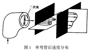 流體流過彎管由于離心力作用,靠外壁產(chǎn)生擴(kuò)散效應(yīng),內(nèi)壁產(chǎn)生收縮效應(yīng),由此產(chǎn)生橫向流動(dòng)的二次流,引起下游產(chǎn)生速度分布畸變,如圖1所示。圖1中,右邊垂直剖面彎管外緣流速較快,水平剖面呈雙峰值流速分布。隨著液流離開彎管距離增加.畸變會(huì)趨于緩和。