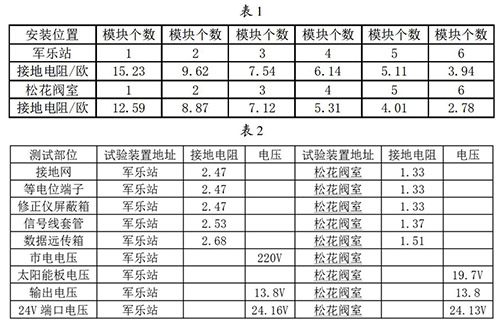 接地網(wǎng)的安裝與連接:接地網(wǎng)是整個(gè)乙二醇流量計(jì)防雷試驗(yàn)比較關(guān)鍵的一個(gè)內(nèi)容,能不能準(zhǔn)確的論證試驗(yàn)的有效性,必須保證接地網(wǎng)達(dá)到標(biāo)準(zhǔn)的接地電阻,通過對(duì)實(shí)地地電阻率的測(cè)試,初步選擇6個(gè)接地模塊埋設(shè)并配用降阻劑使用,邊安裝邊測(cè)試直到達(dá)到標(biāo)準(zhǔn)值后才引入等電位箱。在軍樂站和松花閥室安裝模塊并測(cè)試數(shù)據(jù)見表1。