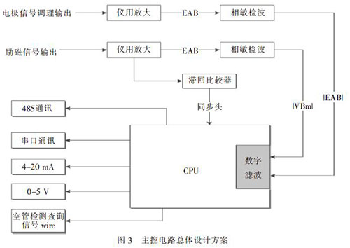電極檢測出的微弱感應(yīng)電動勢E, 先經(jīng)前置放大器的放大和噪聲抑制而成為大幅度低阻抗的電壓信號。此信號經(jīng)相敏檢波后,給CPU 進(jìn)行數(shù)字濾波、處理和控制,通過利用雙線性變換法將模擬的二階巴特沃斯低通濾波器轉(zhuǎn)換為數(shù)字式濾波器,既簡化電路設(shè)計(jì),且可靠性高、穩(wěn)定性好。通過編寫軟件CPU 能對放大器的溫度漂移及零點(diǎn)漂移給予補(bǔ)償, 并在測量的全量程范圍內(nèi)分10 段對信號進(jìn)行非線性修正,使得測量值更好地?cái)M合真實(shí)數(shù)據(jù)??展軝z測電路上,CPU 作為從控制器。當(dāng)主控制電路上發(fā)出空管檢測查詢信號wire, 從控制器進(jìn)行識別后接收并判斷出查詢什么信號,然后產(chǎn)生應(yīng)答信號上傳至主控芯片輸出顯示;當(dāng)檢測為空管信號時, 從CPU 發(fā)出的zero 信號通過控制MOS 管開關(guān)來關(guān)斷流速輸出。在應(yīng)用中,對于微弱信號的放大及提取還需注意PCB 板設(shè)計(jì)時EMI 電磁屏蔽考慮,屏蔽來自空間磁場的干擾、周邊設(shè)備的輻射造成的干擾和板內(nèi)之間的干擾,如數(shù)模分離、強(qiáng)弱電分離等等。