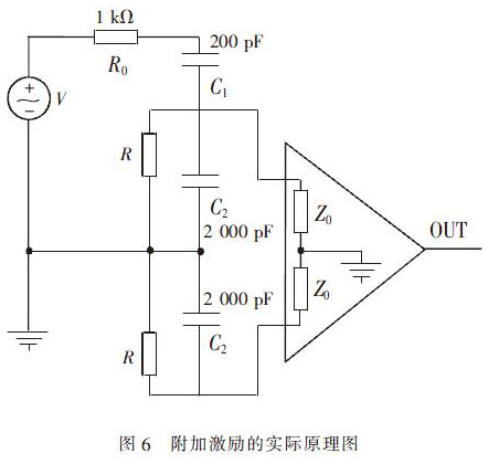 如圖6 所示為附加激勵的實(shí)際原理圖。其中R是流體電阻,C1是激勵源與傳感器電極及其放大器輸入的隔直電容,C2是信號電纜的對地電容。