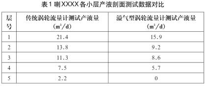 圖1、圖2為該井全井流量測試曲線,從圖1可以看出使用傳統(tǒng)渦流量計測試時該井流量曲線受到井內(nèi)原油脫氣影響產(chǎn)生了較大跳動,對流量測試產(chǎn)生了較大的干擾,測試結(jié)果為56.2m 3 /d。而采用瓦斯流量計測試后,測試曲線較為平穩(wěn)、沖次明顯(圖2),渦輪沒有受到原油脫氣影響,說明溢氣型短節(jié)排氣效果良好,全井流量測試結(jié)果僅為39.4m 3 /d。為了進(jìn)一步對比,地質(zhì)部門對該井進(jìn)行了罐車量油,量油結(jié)果為產(chǎn)液39.1 m 3 /d。由此可見,瓦斯流量計流量測試結(jié)果明顯優(yōu)于傳統(tǒng)的瓦斯流量計測試結(jié)果,那么其測試的各小層產(chǎn)液數(shù)據(jù)也就更加準(zhǔn)確,因此測試脫氣嚴(yán)重的抽油機(jī)井產(chǎn)液剖面時應(yīng)該盡可能采用瓦斯流量計。表1為喇XXXX井各小層流量測試結(jié)果,可以看出使用傳統(tǒng)瓦斯流量計測試的各小層流量均高于瓦斯流量計測試結(jié)果。測試層5時傳統(tǒng)瓦斯流量計測試結(jié)果為2.2 m 3 /d,而實際上渦輪轉(zhuǎn)動是氣體沖擊導(dǎo)致的,采用瓦斯流量計后發(fā)現(xiàn)該層產(chǎn)液量低于啟動排量無法測試。