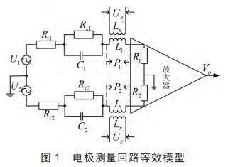 提出在硬件電路上加入模擬開關(guān), 干擾尖峰到來時(shí)斷開模擬開關(guān)避免干擾進(jìn)入后級(jí)電路,尖峰過去重新打開模擬開關(guān);K.Saito 等提出漂移校正法,先以高勵(lì)磁頻率進(jìn)行勵(lì)磁,在勵(lì)磁過程中插入低勵(lì)磁頻率提取用于漂移校正的非固定微分噪聲分量,但在插入的低勵(lì)磁頻率段漿液噪聲較大且很難將漿液噪聲與流量信號(hào)分離,此時(shí)的校正因子非單純的非固定噪聲分量,改進(jìn)措施是長(zhǎng)時(shí)間取平均值得到穩(wěn)定因子。 傳統(tǒng)方法是同步采樣保持法,即在磁場(chǎng)穩(wěn)定階段采樣。 其他消除干擾的方法有設(shè)置干擾補(bǔ)償機(jī)構(gòu)、控制勵(lì)磁電流變化率減小干擾幅值、矩形波代替梯形波、希爾伯特黃變換結(jié)合傅里葉變換和程控增益技術(shù)等。經(jīng)上述對(duì)現(xiàn)有的文獻(xiàn)分析與總結(jié)可知, 當(dāng)前消除微分噪聲主要從信號(hào)處理方面入手,并未對(duì)影響噪聲的因素加以研究。 本文建立電極測(cè)量回路等效模型,給出仿真模型搭建、參數(shù)取值和仿真結(jié)果分析。