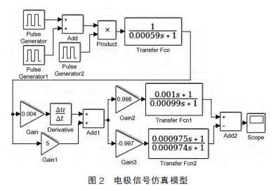 本文基于 Matlab 中 Siumlink 對(duì)電極信號(hào)進(jìn)行仿真,勵(lì)磁方式為三值波勵(lì)磁,勵(lì)磁頻率 f=25Hz,傳感器參數(shù) D=40mm、Rx=88.8Ω、Lx=162mH,勵(lì)磁系統(tǒng)參數(shù) Ue=100V、穩(wěn)態(tài)電流 I0=200mA。基于電極測(cè)量回路搭建的仿真模型如圖 2 所示,圖中信號(hào)模塊 pulsGenerator 通過加法器、乘法器得到勵(lì)磁電流。由公式(1),在固定流速下感應(yīng)電勢(shì)與勵(lì)磁電流成正比,通過增加 Gain1 模塊得到感應(yīng)電勢(shì)信號(hào)。 對(duì)勵(lì)磁電流進(jìn)行求導(dǎo)即經(jīng)模塊 Derivative 得到微分噪聲, 其中 Gain 值與 Lx 和 L1 相關(guān)。 感應(yīng)電勢(shì)與噪聲經(jīng)Add1 疊加之后得到電極信號(hào) E1(t)。 scope 觀察輸出信號(hào)波形。仿真波形和真實(shí)波形如圖 3 所示。 將傳感器參數(shù)代入到勵(lì)磁電流穩(wěn)態(tài)調(diào)節(jié)時(shí)間公式中,得電流上升時(shí)間為 360μs,測(cè)得實(shí)際上升時(shí)間為 390μs,兩者相差不大,驗(yàn)證了仿真模型的正確性。