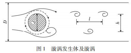 氮?dú)饬髁坑?jì)是由漩渦發(fā)生體、頻率檢測(cè)器和信號(hào)轉(zhuǎn)換器等環(huán)節(jié)組成,輸出 4 ~ 20 mADC 信號(hào)或脈沖電壓信號(hào)。其測(cè)量原理是在流動(dòng)的流體中的垂直流動(dòng)方向安放 1 根或多根非流體型阻流體,在一定的流量范圍內(nèi),流體在阻流體兩側(cè)交替地分離、釋放出 2 串頻率正比于管道內(nèi)的平均流速、規(guī)則的、不對(duì)稱有規(guī)律的交替漩渦列,如圖 1 所示,且兩側(cè)漩渦旋轉(zhuǎn)方向相反。采用檢測(cè)元件測(cè)出漩渦頻率就可以推算出流體的流量。