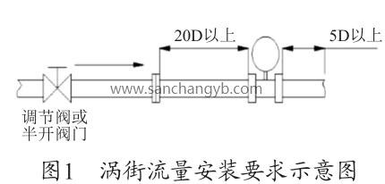 根據(jù)圖1渦街流量安裝要求示意圖及廠家的設(shè)備說明書要求,流量計(jì)上游的直管段長(zhǎng)度至少為20D≈1 600mm,下游的直管段至少在5D≈400mm,D=80mm 為管道直徑。圖2為現(xiàn)場(chǎng)安裝圖,流量計(jì)上游僅為600mm <1 600mm,此流量計(jì)安裝位置有誤,對(duì)測(cè)量值有一定的影響,造成測(cè)量偏差,需調(diào)整流量計(jì)的安裝位置。