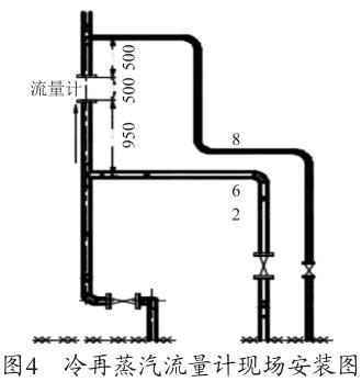根據(jù)圖1渦街流量安裝要求示意圖及廠家的設(shè)備說明書要求,流量計(jì)上游的直管段長(zhǎng)度至少為20D≈1 300mm,下游的直管段至少在5D≈325mm,D=65mm 為管道直徑。圖4為冷再蒸汽流量計(jì)現(xiàn)場(chǎng)安裝圖,流量計(jì)上游僅為950mm<1600mm,此流量計(jì)安裝位置有誤,對(duì)測(cè)量值有一定的影響,造成測(cè)量偏差,需調(diào)整流量計(jì)的安裝位置。