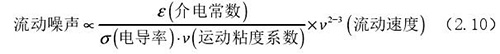 流動噪聲主要出現(xiàn)在低電導(dǎo)率流體的檢測中,由輸出端輸出的直流極化電壓時常出現(xiàn)左右擺動的現(xiàn)象,而此種擺動的電壓被稱為流動噪聲。上式(2.5)中可以觀察了解到流體電導(dǎo)率和流動噪聲呈現(xiàn)出負相關(guān)關(guān)系,由此可以了解到在進行低電導(dǎo)率的計算中需要重點考慮位移電流。