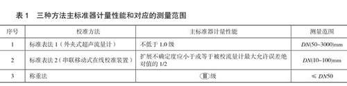三種方法標(biāo)準(zhǔn)器的測量范圍應(yīng)覆蓋被校流量計(jì)的測量范圍。標(biāo)準(zhǔn)表法 1 中,超聲波流量計(jì)在實(shí)驗(yàn)室不同管道口徑和不同管道材質(zhì)標(biāo)定的系數(shù)各不相同,為提高在線校準(zhǔn)準(zhǔn)確度,應(yīng)將超聲流量計(jì)的換能器探頭在實(shí)驗(yàn)室用不同管徑、不同材質(zhì)的管道進(jìn)行流量修正系數(shù)的標(biāo)定,標(biāo)準(zhǔn)表現(xiàn)場使用時的條件與實(shí)驗(yàn)室溯源的條件應(yīng)保持一致或接近。