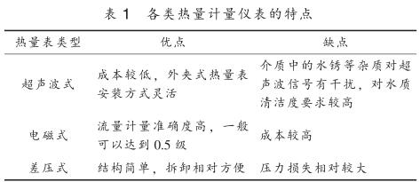 目前供熱行業(yè)內(nèi)使用的熱量計(jì)量?jī)x表按工作原理主要分為超聲波式、 電磁式、 差壓式, 其特點(diǎn)見表 1 。 熱量計(jì)量?jī)x表按結(jié)構(gòu)可分為一體式和分體式, 一體式熱量表將一支入口或出口溫度傳感器嵌入到流量傳感器管道中, 并配有專門的計(jì)算器進(jìn)行熱量計(jì)算; 分體式熱量表采用單獨(dú)的流量傳感器, 包括超聲波流量計(jì)、 電磁流量計(jì)、 差壓流量計(jì)、飽和鹽水流量計(jì)等, 溫度測(cè)量采用單獨(dú)的鉑電阻溫度計(jì)或溫度變送器測(cè)量供回水管道溫度, 再配備熱量積算儀進(jìn)行溫度和流量信號(hào)采集得到熱量值。