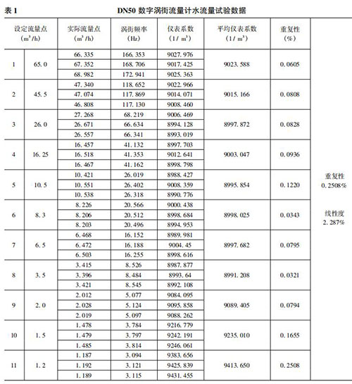 將本文實(shí)現(xiàn)的數(shù)字煙氣流量計(jì)在上述 50mm 口 徑( 簡(jiǎn)稱 DN50) 的水流量試驗(yàn)裝置上進(jìn)行試驗(yàn)。先在其正常流量范圍內(nèi)進(jìn)行試驗(yàn),流量從大到小逐漸降低,之后不斷探求其所能測(cè)量的*小流量。每個(gè)流量點(diǎn)試驗(yàn)三次,計(jì)算其重復(fù)性、平均儀表系數(shù)和線性度。水流量試驗(yàn)數(shù)據(jù)如表 1 所示。