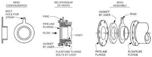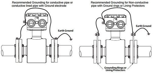 晶片式流量管:將晶片式流量管安裝在非金屬,塑料,PVC或帶襯里的工藝管道之間時(shí),需要接地環(huán)。必須通過(guò)將隨附的隨附的SG連接線連接到接地環(huán),將SG傳遞到流量管的主體/外殼上(圖6.)。