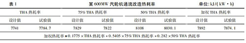 隨著火電機組利用小時數(shù)降低,發(fā)電企業(yè)一般都會根據(jù)不同負荷工況下的實際運行小時數(shù),確定機組熱耗率考核權(quán)重,形成*終的加權(quán)熱耗率考核值。考核加權(quán)熱耗率對設備廠家末級葉片選型、高壓調(diào)門與高壓缸匹配性提出了更高的要求,在當前負荷率偏低的情況下增強了發(fā)電企業(yè)的競爭力。然而,僅僅對加權(quán)熱耗率進行考核是不夠的,設備廠家為了增強自身的競爭力,往往會把全部重點放在如何降低占比大的低負荷熱耗率上而犧牲高負荷的熱耗率,這無疑削弱了發(fā)電企業(yè)的適應性。某廠一臺 600MW 汽輪機通流改造時僅對加權(quán)熱耗率進行考核,THA 熱耗率要高出設計值43. 7 kJ/( kW·h) ,詳見表 1。通流改造時既要對加權(quán)熱耗率進行考核,也要對 THA工況時熱耗率進行考核。