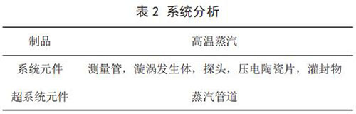 建立已有系統(tǒng)的功能模型(見(jiàn)圖 1)。通過(guò)功能模型分析,描述了系統(tǒng)元件及其之間的相互關(guān)系,并得出導(dǎo)致傳感器耐受溫度不足問(wèn)題的功能因素:高溫蒸氣對(duì)測(cè)量管傳熱;測(cè)量管對(duì)探頭傳熱;探頭對(duì)灌封物傳熱;灌封物對(duì)壓電陶瓷片傳熱;高溫蒸氣對(duì)探頭傳熱。