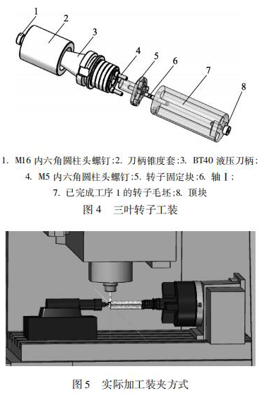 目前量產中的轉子都是型材毛坯,采用成型砂輪磨削或者定制成型銑刀進行加工轉子曲面。這種加工方式工藝成熟,適合大批量生產,而且有利于轉子線型的技術保密,但加工方式在研發(fā)試制中應用試制加工周期會很長,而且成本很高,不適合單件或小批量試制。為此,筆者基于四軸立式加工中心,結合三葉轉子加工工藝提出一種工裝,如圖 4所示。將這套工裝定位在立式加工中心四軸回轉中心上,加工裝夾方式如圖 5 所示。用機床尾軸頂住轉子來增強加工剛性避免切削時產生震顫。