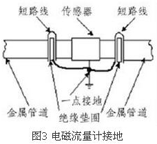 (4)盡量避開振動源、磁源(大功率電機(jī)、變壓器)由于水電磁流量計的測量感應(yīng)電壓很小,電壓較低,易受外界電磁噪聲的影響,故在安裝時應(yīng)進(jìn)行可靠的接地連(跨)接。金屬管道水電磁流量計接地連(跨)接方法如圖3所示