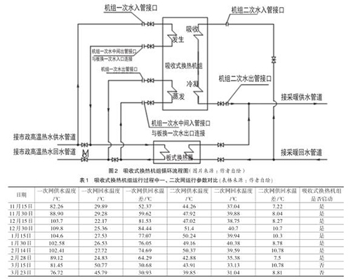 此熱力站高溫渦街流量計(jì)的一次網(wǎng)設(shè)計(jì)供回水設(shè)計(jì)溫度為 :120℃ /36℃,二次網(wǎng)設(shè)計(jì)供回水溫度為 :80℃ /60℃。在高溫渦街流量計(jì)工作流程中(見(jiàn)圖2),高溫?zé)嵩矗匆淮尉W(wǎng)供水)先進(jìn)入高溫渦街流量計(jì),發(fā)生器作為驅(qū)動(dòng)熱源,換熱后進(jìn)入板式換熱器,經(jīng)板式換熱器換熱后的低溫水再次回到高溫渦街流量計(jì)的蒸發(fā)器,放熱至36℃后返回電廠。熱用戶的二次網(wǎng)回水并聯(lián)后分別進(jìn)入高溫渦街流量計(jì)吸收器和板式換熱器,在吸收器和冷凝器及板式換熱器中分別進(jìn)行熱交換,然后一起供給熱用戶。上述過(guò)程就是在高溫渦街流量計(jì)啟動(dòng)時(shí),熱力站內(nèi)的實(shí)際供熱流程,在供暖季的初期和末期,可以關(guān)閉高溫渦街流量計(jì),仍然利用板式換熱器單好換熱。