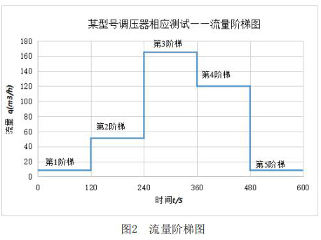 該測(cè)試主要利用實(shí)驗(yàn)室測(cè)試條件,模擬客戶現(xiàn)場(chǎng)使用情況。其主要測(cè)試內(nèi)容包括:測(cè)試電磁流量計(jì)在+23℃,-30℃和-40℃三種溫度下,電磁流量計(jì)出口壓力分別在2.1kPa和30kPa時(shí),流量分別從*1階梯到*5階梯時(shí)的響應(yīng)速度,客戶所提供的流量階梯如圖2所示。橫軸表示下游球閥開(kāi)啟動(dòng)作時(shí)間,縱軸表示高溫電磁流量計(jì)下游需要的流量q。