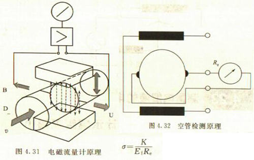 非滿管檢測也是基于電導(dǎo)率檢側(cè)的方法。在圖4.33所示的電磁流量傳感器中,增加了一個(或一對)非滿管檢測電極。當導(dǎo)管內(nèi)液體滿管時,頂部電極與其他電極之間的電阻值很小;而當存在非滿管情況時,頂部電極與導(dǎo)電液體之間有氣體阻隔,所以電極電阻顯著增大,從而做出非滿管判斷。