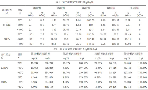 為了深入研究溫度及流量突變對衛(wèi)生級電磁流量計響應速度的影響趨勢,把每個流量突變點前后的出口壓力p2,流量q列表如表1所示。