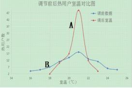 我公司在該小區(qū)管網(wǎng)改造前,在不同單元不同樓層分別安裝100臺(tái)室溫采集器。渦街流量計(jì)調(diào)前數(shù)據(jù)采集于2017~2018年供熱期,調(diào)后數(shù)據(jù)采集于2018~2019年供熱期。經(jīng)過兩個(gè)采暖期,共有96臺(tái)室溫采集器可以正常提供數(shù)據(jù)。數(shù)據(jù)分析結(jié)果見圖3所示。