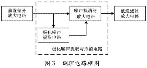 根據(jù)前饋控制的自適應極化噪聲抵消原理,設(shè)計了信號調(diào)理電路2,以實現(xiàn)極化噪聲的濾除。信號調(diào)理電路2主要包括前置差分放大電路、極化噪聲提取與抵消電路、低通濾波放大電路三部分。調(diào)理電路如圖3所示。