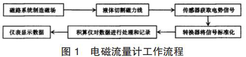 智能渦輪流量計(jì)的產(chǎn)生主要是基于法拉*電磁感應(yīng)定律。在智能渦輪流量計(jì)的應(yīng)用中,磁路系統(tǒng)會(huì)在流量計(jì)運(yùn)行過程中逐步出現(xiàn)直流磁場(chǎng)與交流磁場(chǎng),該磁場(chǎng)的產(chǎn)生為后期的測(cè)量提供了良好的前提條件,營造了測(cè)量所需的磁場(chǎng)環(huán)境,因此,在智能渦輪流量計(jì)應(yīng)用時(shí),一旦被測(cè)液體在導(dǎo)管中經(jīng)過該磁場(chǎng)環(huán)境時(shí),必然會(huì)產(chǎn)生一定的切割磁力線運(yùn)動(dòng),在這種情況下,電極傳感器就會(huì)發(fā)揮其作用,將導(dǎo)管內(nèi)的流量轉(zhuǎn)換為感應(yīng)電勢(shì)信號(hào),隨后此轉(zhuǎn)換形成的信號(hào)逐步被傳遞給轉(zhuǎn)換器。而轉(zhuǎn)換器更是可以將所獲得的流量信號(hào)等加以處理,通過分析、對(duì)比等,轉(zhuǎn)換器會(huì)將該信號(hào)變?yōu)闃?biāo)準(zhǔn)信號(hào),隨后將該信號(hào)輸出給積算儀,進(jìn)一步進(jìn)行信號(hào)的處理,這些處理以后的信號(hào)*終會(huì)在智能渦輪流量計(jì)的儀表中顯示,呈現(xiàn)*終的流量測(cè)量結(jié)果,其基本的流程如圖 1 所示。
