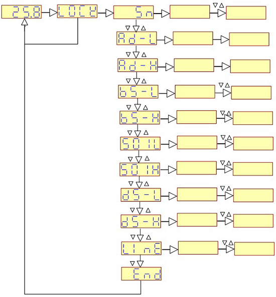 菜單 AD-L 和 AD-H 為變送器采集菜單,此菜單數(shù)據(jù)無需輸入,按 SET 進入數(shù)據(jù)采集 以后顯示的是上次采集到的數(shù)據(jù),十進制顯示,按位選鍵或者增加鍵開始采集,此時需要根 據(jù)需要輸入需要采集的電阻值即可,按 SET 保存并返回菜單狀態(tài)。