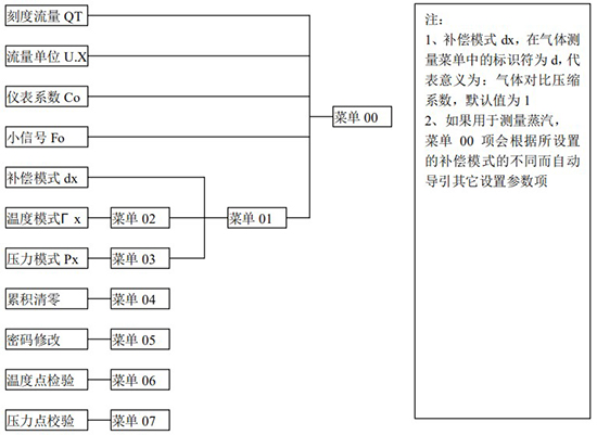 (3)標(biāo)況流量計(jì)算公式(若補(bǔ)償后單位為 U.0):(4)標(biāo)況流量計(jì)算公式(若補(bǔ)償后單位為 U.1):注:標(biāo)況指 20℃,1 標(biāo)準(zhǔn)大氣壓三、一體化液晶顯示表頭參數(shù)設(shè)置操作說明(V03Z)1、鍵盤按鍵說明2、 顯示窗字符說明注:表中 x 代表“0”或“1”;Zn:標(biāo)準(zhǔn)狀態(tài)下(20℃,1 標(biāo)準(zhǔn)大氣壓),被測氣體的壓縮系數(shù),Z:工作狀態(tài)下被測氣體的壓縮系數(shù)3、 操作說明3.1、本儀表表頭采用自導(dǎo)引式和菜單式相結(jié)合的參數(shù)設(shè)置方式,所謂自導(dǎo)引式參數(shù)設(shè)置方式就是用戶在進(jìn)入菜單 00 項(xiàng)后,表頭中的微電腦會(huì)自動(dòng)導(dǎo)引用戶去設(shè)置需要設(shè)置的參數(shù)。另外,用戶也可以通過菜單模式分別對(duì)各組參數(shù)進(jìn)行設(shè)置。蒸汽測量菜單框圖如下:3.2、參數(shù)設(shè)置約定:在設(shè)置各項(xiàng)參數(shù)時(shí),提示符閃動(dòng)代表該項(xiàng)參數(shù)沒有設(shè)置完或者尚未確認(rèn),可以通過按SET 鍵來確認(rèn)或者按→鍵退出;提示符不閃動(dòng)代表該項(xiàng)參數(shù)已設(shè)置完并確認(rèn),此時(shí)可以通過按 SET 鍵翻頁或者按→鍵退出。進(jìn)入?yún)?shù)設(shè)置時(shí),需要輸入密碼(6 位)并確認(rèn)進(jìn)入,為了防止誤進(jìn)入?yún)?shù)設(shè)置菜單,保證儀表正常工作,在設(shè)置密碼時(shí),使用↑鍵調(diào)數(shù)時(shí)不能循環(huán)調(diào)數(shù),只能單次調(diào)數(shù),只有密碼輸入正確進(jìn)入各項(xiàng)參數(shù)設(shè)置菜單后才可以對(duì)各位循環(huán)連續(xù)調(diào)整數(shù)據(jù)。3.3、儀表參數(shù)設(shè)置舉例:儀表出廠前各項(xiàng)參數(shù)已設(shè)置好,用戶無需設(shè)置。如果用戶需要設(shè)置某項(xiàng)參數(shù),請(qǐng)參照以下步驟,例如修改刻度流量值 QT:在工作狀態(tài)下,按 SET 鍵,顯示屏顯示 P,數(shù)字位為全零,8 秒鐘若無操作,自動(dòng)返回工作狀態(tài)。輸入密碼 :按數(shù)字↑鍵和左移←鍵,輸入密碼數(shù) xxxxx(出廠時(shí)默認(rèn)密碼為 000123),↑鍵調(diào)各位數(shù)字 0-9,每按 ←鍵一次數(shù)字向右循環(huán)一位,可通過多次按←鍵對(duì)整段數(shù)字清零,按→鍵可以返回工作狀態(tài)。菜單選擇項(xiàng):按 SET 鍵確認(rèn),顯示屏顯示如右圖所示,末行“00”閃動(dòng)調(diào)整該項(xiàng)值選擇不同參數(shù)設(shè)置菜單。該例直接按 SET 鍵進(jìn)入菜單 00 項(xiàng)設(shè)置刻度流量:QT 閃動(dòng),*一步:*先進(jìn)行小數(shù)點(diǎn)調(diào)整,可以通過←鍵對(duì)參數(shù)快速清零或者通過↑鍵進(jìn)行小數(shù)點(diǎn)調(diào)整,調(diào)整完畢,按 SET 鍵確認(rèn)(QT 仍閃動(dòng));*二步:數(shù)值調(diào)整,可以通過↑鍵對(duì)每位數(shù)字進(jìn)行調(diào)整,按 ←鍵一次數(shù)字向右移動(dòng)一位,調(diào)整完畢,按 SET 鍵確認(rèn),QT 停止閃動(dòng),該項(xiàng)參數(shù)設(shè)置完畢,可進(jìn)行下一項(xiàng)參數(shù)設(shè)置或者退出另外,單位設(shè)置 U.X 和補(bǔ)償方式設(shè)置 dX 通過↑鍵調(diào)整修改。3.4、校驗(yàn)項(xiàng)說明: 儀表出廠前,溫度和壓力通道已校驗(yàn)設(shè)置好,無需用戶重新校驗(yàn)。校驗(yàn)通道有密碼保護(hù),廠家不對(duì)外開放,如果需要重新校驗(yàn)溫度或者壓力通道,請(qǐng)專業(yè)人員與廠家技術(shù)人員聯(lián)系。4、計(jì)算公式說明4.1、蒸汽測量計(jì)算公式(1)渦街流量儀表工況體積流量計(jì)算公式:(2)密度 d,單位 Kg/m3(3)質(zhì)量流量計(jì)算公式,單位 Kg/h:(4)質(zhì)量流量計(jì)算公式,單位 t/h:4.2、氣體測量計(jì)算公式----標(biāo)況指 20℃,1 標(biāo)準(zhǔn)大氣壓(1)渦街流量儀表工況體積流量計(jì)算公式:(2)對(duì)比壓縮系數(shù) d(Zn/Z),單位 1(3)標(biāo)況流量計(jì)算公式,單位 Nm3/h:P1—工況絕壓,PN—標(biāo)況絕壓(Mpa),T1—工況熱力學(xué)溫度,TN—標(biāo)況熱力學(xué)溫度(K)