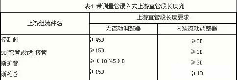 2) 浸入式 帶測(cè)量管的浸入式流量傳感器和插入式儀表需要一定長度前置直管段,iso/dis 14511對(duì)此未作具體規(guī)定,而按制造廠建議的值。bs 7405建議對(duì)于在管道中用插入熱絲流速計(jì)時(shí),需要(8~10)d的上游直管段和(3~5)d的下游直管段。表4列舉sierra公司對(duì)帶測(cè)量管浸入式tmf所規(guī)定的上直管段長度;若在其進(jìn)口端裝一塊或二快多孔板式流動(dòng)調(diào)整器(整流器)后,則其長度可大為縮短,如表*右列所示。