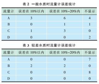 從表2和表3發(fā)現(xiàn),試驗(yàn)中水質(zhì)一般(濁度<50mg/L)的情況下,時(shí)差法流量計(jì)的有效數(shù)據(jù)(誤差<20%)為13個(gè),占總試驗(yàn)數(shù)據(jù)(32個(gè))的40.63%;不顯示的情況有4個(gè),占總試驗(yàn)數(shù)據(jù)(32個(gè))12.5%的。水質(zhì)較差(濁度≥50mg/L)的情況下,多普勒法流量計(jì)的有效數(shù)據(jù)(誤差<20%)為4個(gè),占總試驗(yàn)數(shù)據(jù)(32個(gè))的12.5%;該類型流量計(jì)不存在不顯示的情況。