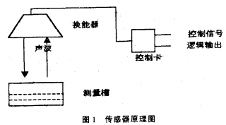 常見的液位傳感器有磁浮筒式、壓力式等,磁浮筒式傳感器要安裝在被測(cè)介質(zhì)中,長時(shí)間使用易被腐蝕,而壓力傳感器輸出線性較差且成本較高。超聲波傳感器的特點(diǎn)是使用時(shí)與液面脫離接觸,無腐蝕問題,且價(jià)格低廉。超聲波傳感器由控制卡及換能器構(gòu)成,如圖I。