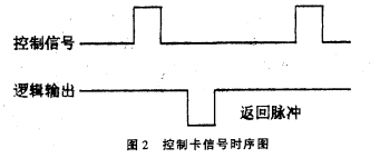 其外部特性如圖2所示。其工作原理是,每當(dāng)在“控制信號(hào)”端加一正脈沖(寬度0.2ms),控制卡便通過換能器發(fā)一束超聲波,當(dāng)超聲波遇被測(cè)污水反射后又被換能器接收,控制卡便通過“邏輯輸出”端輸出一“返回脈沖”。通過計(jì)量“控制信號(hào)”到“返回脈沖”之間的時(shí)間T便可按下式計(jì)算出換能器距被測(cè)污水表面的距離H,由于安裝時(shí)換能器固定在污水的上方(高度不變),因此,換能器距污水底部的距離HO(其值已知)減去H即為污水液位H1。