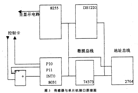 圖3中,單片機(jī)8031、74373和2764組成單片機(jī)核心電路,8255為顯示電路接口,DSl220為不揮發(fā)RAM,用其存儲(chǔ)流量可保證斷電后流量不丟失。工作時(shí)8031每隔一個(gè)采樣周期先啟動(dòng)定時(shí)器T1,然后通過PIO引腳向控制卡發(fā)控制信號(hào),換能器發(fā)一聲波經(jīng)被測(cè)污水反射由換能器接收,控制卡的邏輯輸出端輸出一脈沖,脈沖信號(hào)經(jīng)過或門進(jìn)入INTO腳,引起中斷請(qǐng)求。在中斷服務(wù)程序中從定時(shí)器中取出定時(shí)值,計(jì)算出對(duì)應(yīng)的液位。由于傳感器在發(fā)出聲波后,在4MS以內(nèi)會(huì)產(chǎn)生無用的盲區(qū)脈沖,所以在P10向控制卡發(fā)控制脈沖的同時(shí),通過P11引腳發(fā)一個(gè)4ms的高電平封鎖信號(hào),防止“盲區(qū)脈沖”通過或門進(jìn)入INTO引腳。