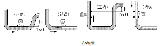 ⑴為了避免由夾附氣體引起的測(cè)量誤差,請(qǐng)觀察如下安裝方法:見圖-1,錯(cuò)誤安裝—裝在管線走向*高點(diǎn)(在測(cè)量中容易聚集空氣泡)。