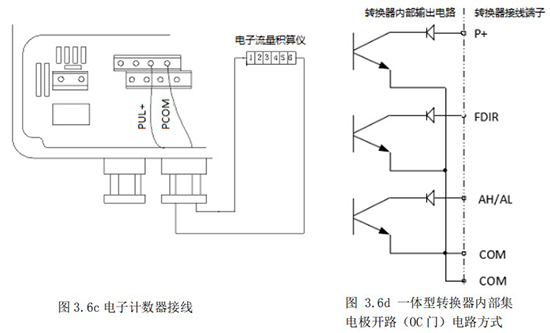 1.5 頻率(脈沖)、上下限報警、流向標(biāo)示等輸出均為集電極開路的電平輸出信號。