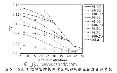 標(biāo)準(zhǔn)差代表磁場測量區(qū)域的磁場分布波動(dòng)性較大,因而需引入變異系數(shù)對(duì)測量區(qū)域中的磁場分布情況進(jìn)一步分析。如圖5所示為不同T型磁芯結(jié)構(gòu)下測量區(qū)域磁場感應(yīng)強(qiáng)度變異系數(shù),圖中橫坐標(biāo)為T型磁芯b的角度,縱坐標(biāo)為測量區(qū)域磁場強(qiáng)度分布的變異系數(shù),圖標(biāo)圖例與圖3中一致。從仿真結(jié)果可以看出:T型磁芯的較長端的角度a越小,流量計(jì)測量區(qū)域中磁場強(qiáng)度變異系數(shù)越大;在T型磁芯的較長端的角度a一定時(shí),T型磁芯的較短端的角度b越小,流量計(jì)測量區(qū)域中磁場強(qiáng)度變異系數(shù)越大;在T型磁芯的較長端的角度a與較短端的角度b一定時(shí),T型磁芯的k1/(k1 + k2)越小,在流量計(jì)測量區(qū)域中磁場強(qiáng)度變異系數(shù)越大。異系數(shù)越大說明磁場分布越不均勻,波動(dòng)性越大;異系數(shù)越小說明磁場分布趨向均勻。下面通過計(jì)算測量區(qū)域中的磁場均勻區(qū)域來對(duì)這一結(jié)果進(jìn)一步的分析。